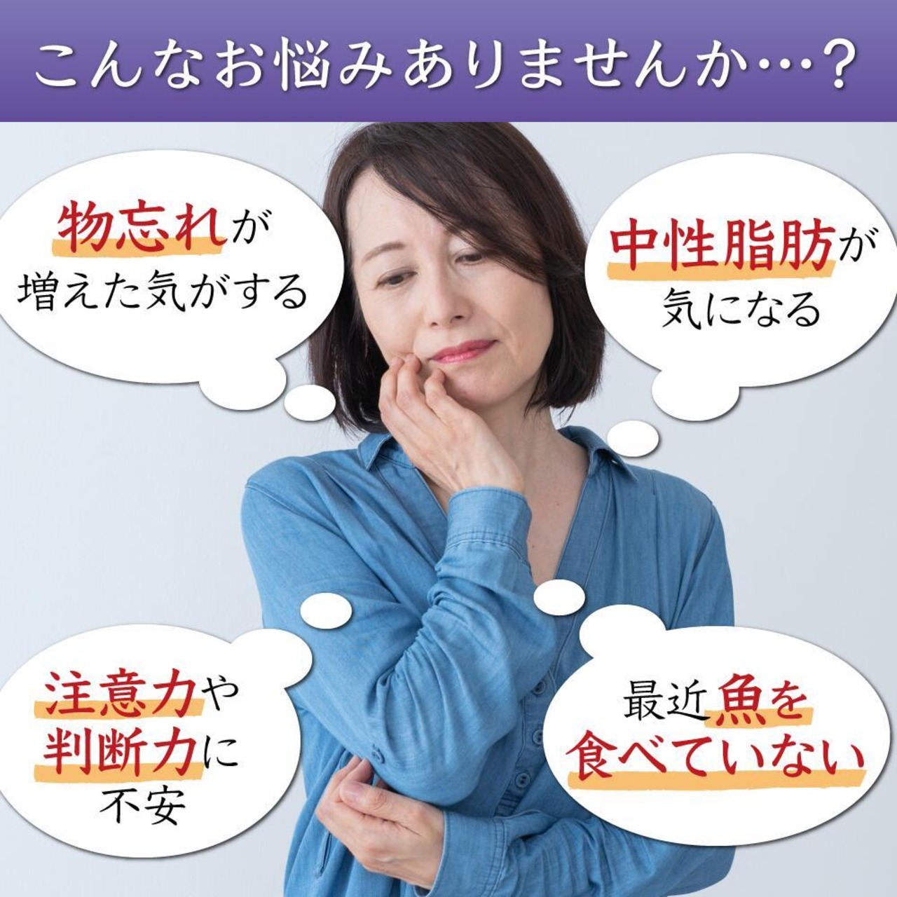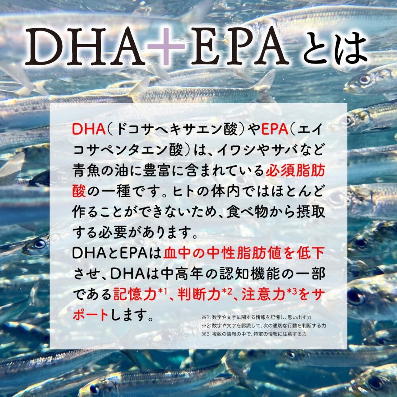 届出表示:本品にはDHA・EPAが含まれます。DHAには、中高年の方の加齢に伴い低下する、認知機能の一部である記憶力、判断力、注意力をサポートすることが報告されています。(記憶力:数字や文字に関する情報を記憶し、思い出す力。判断力:数字や文字を認識して、次の適切な行動を判断する力。注意力:複数の情報の中で、特定の情報に注意する力。)また、DHA・EPAには、血中の中性脂肪を低下させる機能があることが報告されています。