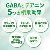 届出表示:本品には、γ-アミノ酪酸(GABA)、L-テアニンが含まれます。GABAには、仕事や勉強などによる一時的・精神的な負荷によるストレスや疲労感を緩和する機能があることが報告されています。また、血圧が高めの方の血圧を下げる機能があることが報告されています。L-テアニンには、夜間の良質な睡眠(起床時の疲労感や眠気の軽減)をサポートすることが報告されています。