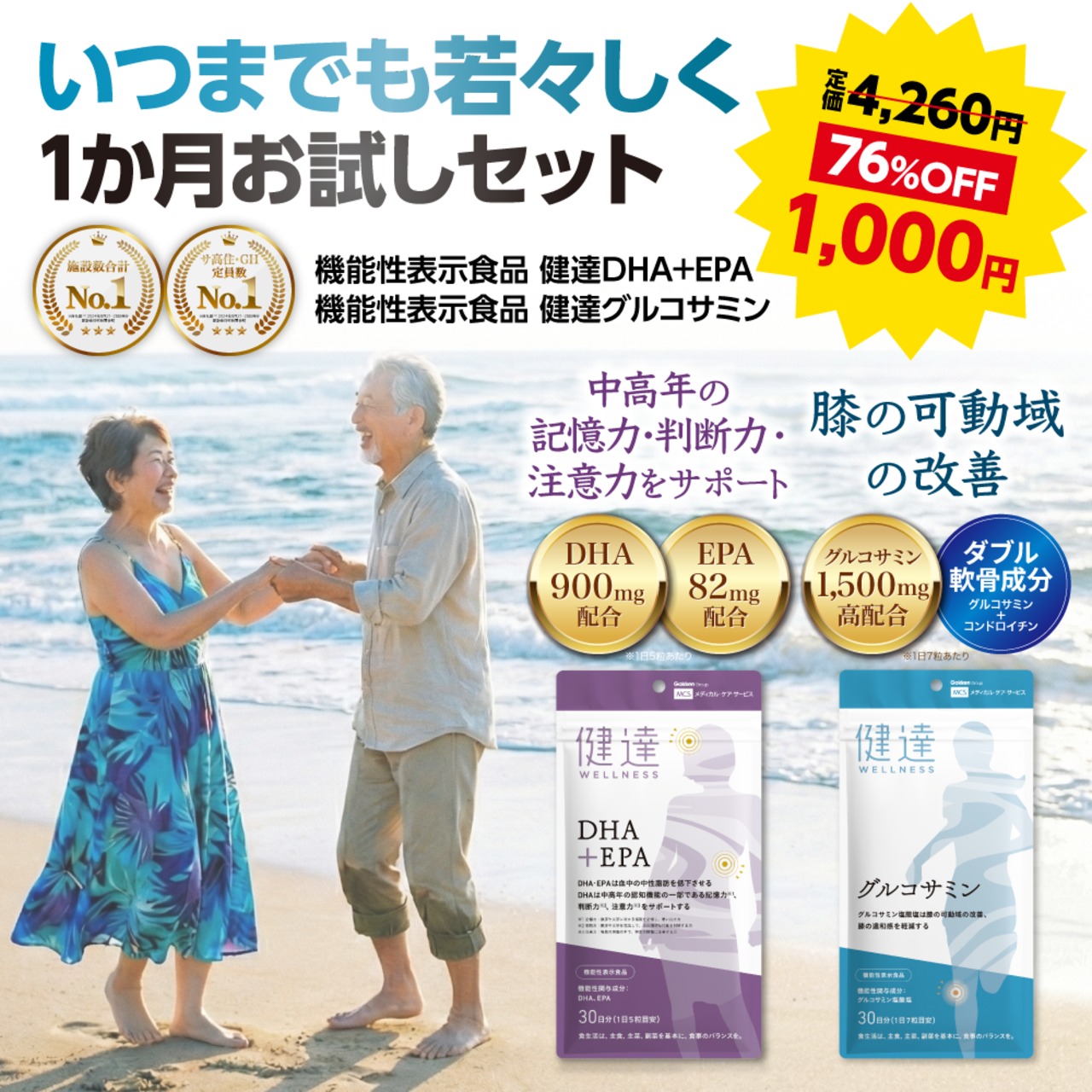 4,260円→76%off 2袋 セット 1袋あたり500円 送料無料 いつまでも若々しく 1か月 お試し 機能性食品 健達 DHA + EPA グルコサミン サプリ 記憶力 関節 足腰 中性脂肪 オメガ3 膝 スムーズ エイジングケア 若返り 習慣 健康維持