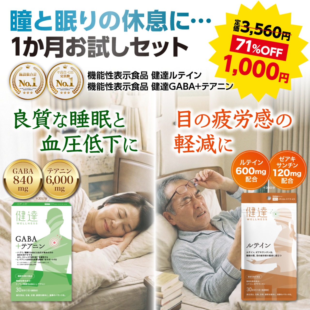 3,560円→71%off 2袋 セット 1袋あたり500円 送料無料 瞳 と 眠り の 休息 1か月 お試し 機能性食品 健達 ルテイン GABA + テアニン サプリ 睡眠 サポート 眠りの質 向上 目の疲れ 眼精疲労 疲労感 軽減 リラックス ぐっすり